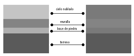 El camuflaje es el producto de la interacción de brillos y colores en la distancia. Al modificarse la luminosidad de la escena se produce un cambio en la percepción de los tonos del terreno y de la muralla que terminan viéndose como iguales. ¿Cómo, entonces, operan los brillos para camuflar la ciudad? Con lo que ya sabemos, voy a realizar un sencillo experimento que explicará qué le sucedió a Larisa. Para ello utilizaré un modelo de parches cuyo brillo interacciona bajo las leyes del contraste simultáneo acromático. El modelo puede extenderse al contraste simultáneo cromático.