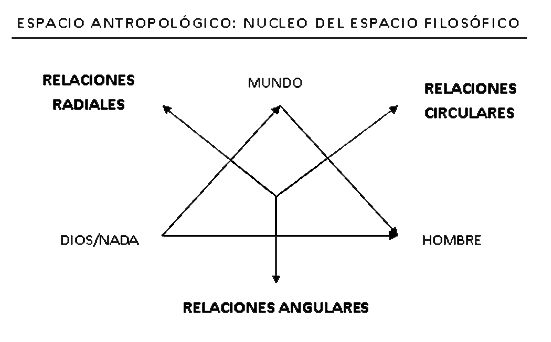 Dios/Nada, Mundo y Hombre sería las palabras que habría hecho explícitas, de manera progresiva, la tradición de la filosofía a lo largo de su historia –o curso filosófico– para denominar las determinaciones sistemáticas, atributivas y distributivas de las ideas respectivamente. Mientras las determinaciones atributivas y distributivas se encuentran al nivel de las operaciones de los términos ideales, las sistemáticas se encuadran al nivel de los enunciados de tales operaciones. En consonancia con esto las relaciones radiales y angulares regulan una transformación material regressus/progressus análogamente a como el sistema de las cónicas supone la intersección de un plano con un doble cono, es decir, implican un espacio tridimensional, mientras que cada cónica se desarrolla en uno bidimensional. En cambio las relaciones circulares determinan más bien el carácter α/β operatorio, es decir, la independencia o no con respecto al sujeto que opera, en tanto que el Mundo (M) ha segregado las operaciones del Hombre (H) y H se determina psicológicamente al operar de manera independiente de M aunque esté inmerso en él, y las determinaciones internas de H sean también de M. Es decir, las determinaciones atributivas y distributivas son conjugadas. En definitiva el espacio antropológico que de modo casi intolerablemente breve he presentado aquí es el núcleo o fundamento del espacio filosófico, como pluralidad en principio muy amplia y variada de instituciones, cuyo sentido último o final es proporcionado por las diferentes iglesias en tanto que clasificación de sus respectivas posturas religiosas.