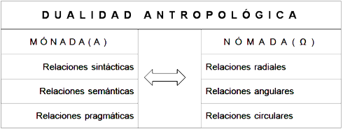 Esta tensión entre caos y orden está muy cerca del fundamento de la antropología como dualidad: entre la mónada (A) y el sentido de la nómada (Ω), que vimos antes. Proponemos que la variedad de conexión entre ambos por medio de operaciones sencillas de clases proporciona un aparato lógico que puede resultar útil para el análisis antropológico de las religiones.