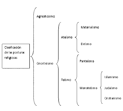 Las tres grandes religiones monoteístas son el judaísmo, el islamismo y el cristianismo. Las tres son posturas gnósticas en tanto que tiene una verdad revelada por los profetas. Ahora bien la naturaleza de ésta verdad es muy distinta. En el Islam Dios permanece al margen de sus principios religiosos que simplemente dictaminan la posibilidad de salvación de los hombres. En el judaísmo el compromiso de Dios es mayor ya que su venida se corresponderá con el reinado de la justicia sobre los hombres. La implicación de Dios en el mundo de los hombres es mayor. Por último en el cristianismo la dinámica trinitaria envuelve completamente a las personas humanas. Podemos esquematizar el conjunto de todas estas posturas religiosas en el siguiente esquema.