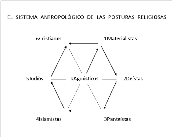 Esta representación gráfica no oculta por el sentido de las flechas la importancia del Cristianismo como la postura en el que la presencia de lo divino se torna más implicada en lo humano, sobre todo aparece en la implicación entre las posiciones 1 (materialistas) y la 6 (cristianos). Pero no sería muy difícil cambiar el sentido de las flechas para destacar cualquier posición. Por otra parte, la posición agnóstica tiene gran importancia porque posibilita de manera muy sencilla el paso de cualquier postura a cualquier otra mediante el paso por ella. Por tanto, tampoco sería descabellado afirmar que precisamente por esta característica central ella debe ser considerada la más importante. Y en cierta medida así es, porque esta postura se caracteriza de una manera muy afín a la misma crítica filosófica que es la que otorga estatuto filosófico a las creencias religiosas aunque por supuesto no es una identidad, porque la crítica también puede y debe tener según mi manera de ver una labor constructiva.
